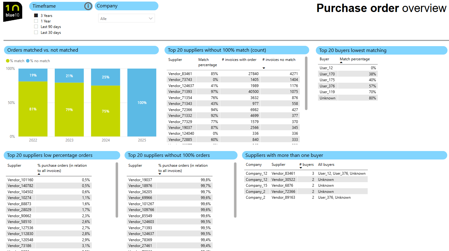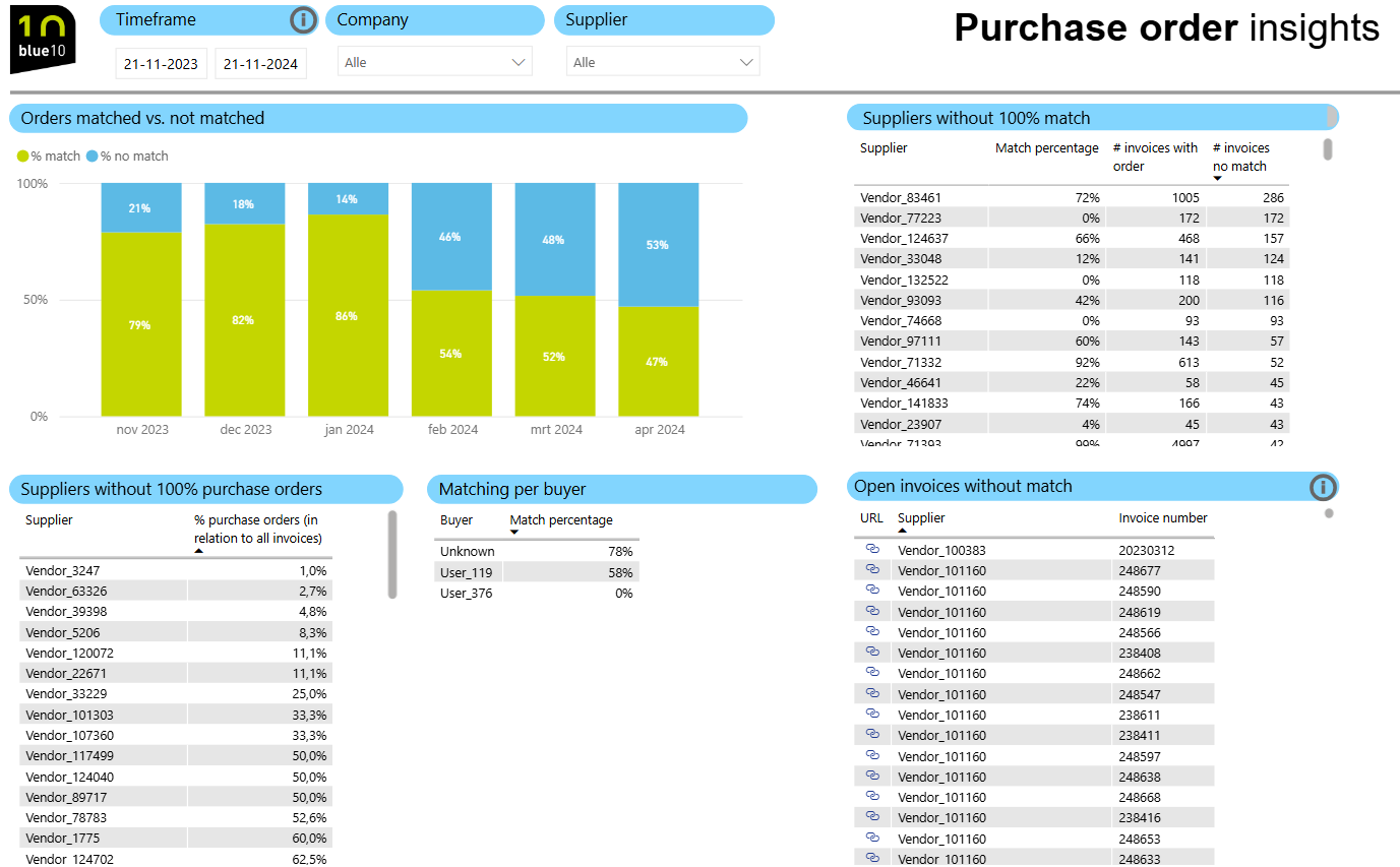 The Purchase Orders report is built in Power BI and provides insight into the processing and matching of purchase orders. If your organisation works with purchase orders, this report provides more detailed information than the Suppliers report. It is a separate report and can be shared with the purchasing department, for example, so that they can see the performance of each supplier or purchaser. The Purchase Orders report is part of the standard Blue10 Power BI report. Data from your own Blue10 environment is made accessible after it has been retrieved via a fast and secure connection to the OData API.